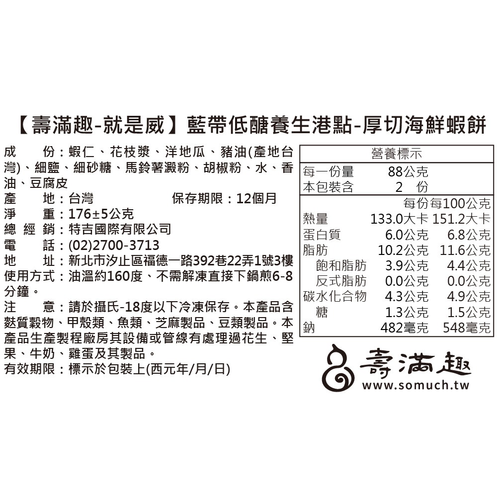 1.商品組合/規格:【壽滿趣】五星藍帶低醣養生系列 -厚切海鮮蝦餅2個