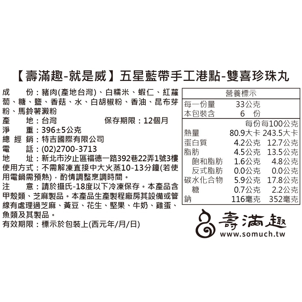 成 份:豬肉(產地台灣)、白糯米、蝦仁、紅蘿蔔、糖、鹽、香菇、白胡椒粉、香油、昆布芽粉、馬鈴薯澱粉