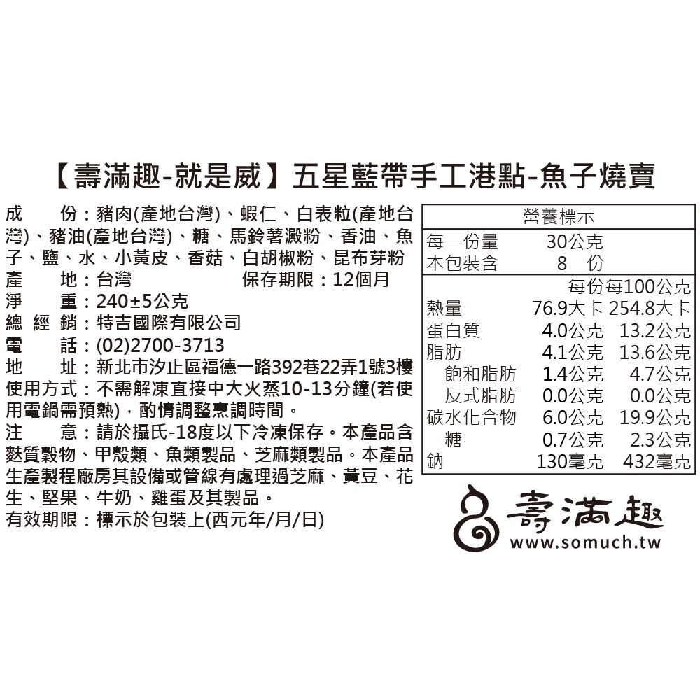 成 份:豬肉(產地台灣)、蝦仁、白表粒(產地台灣)、豬油(產地台灣)、糖、馬鈴薯澱粉、香油、魚子、鹽、小黃皮、香菇、白胡椒粉、昆布芽粉