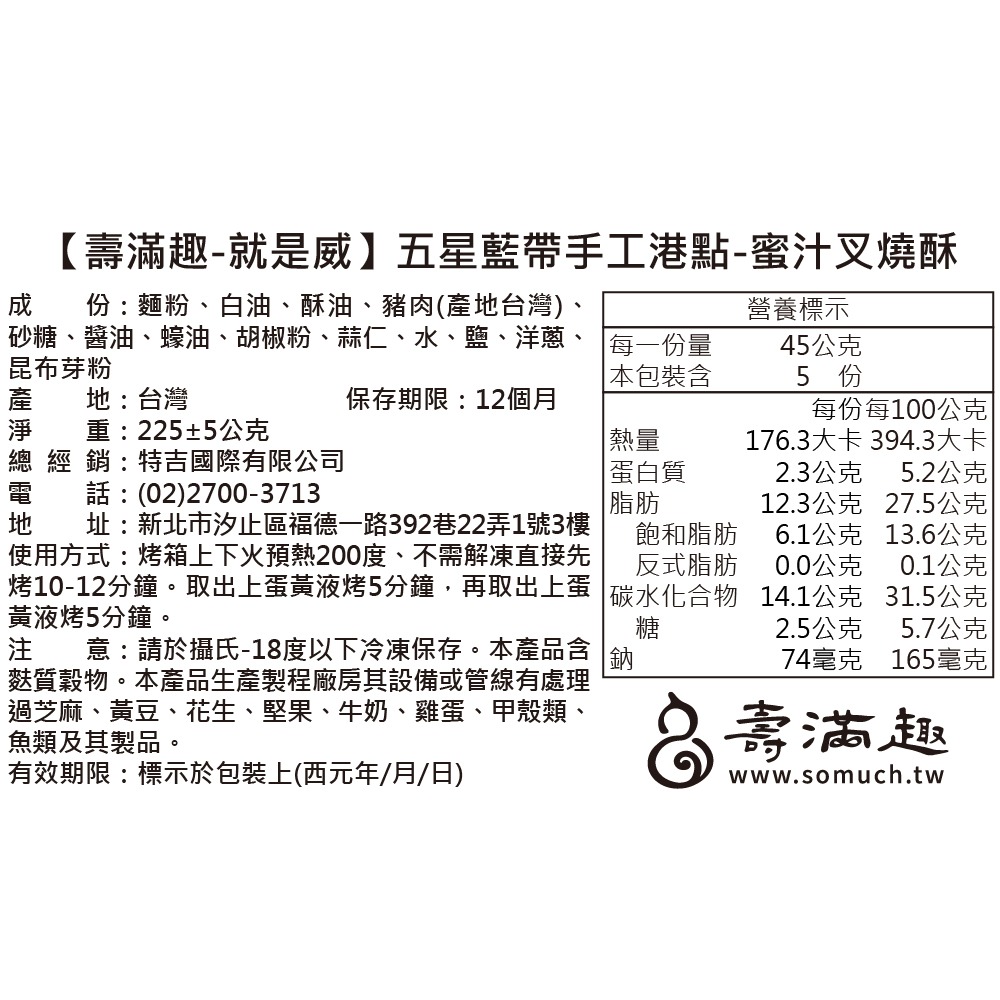 成 份:麵粉、白油、酥油、豬肉(產地台灣)、 砂糖、醬油、蠔油、胡椒粉、蒜仁、水、鹽、洋蔥、 昆布芽粉