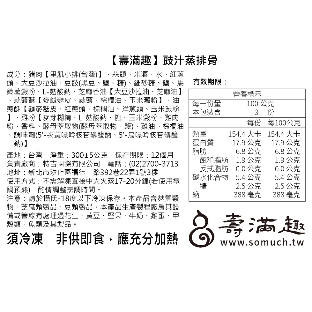 成 份:成分:豬肉【里肌小排(台灣)】、蒜頭、米酒、水、紅蔥頭、大豆沙拉油、豆豉(黑豆、鹽、糖)、細砂糖、鹽、馬鈴薯澱粉、L-麩酸鈉、芝麻香油【大豆沙拉油、芝麻油】、蒜頭酥【麥纖麩皮、蒜頭、棕櫚油、玉米澱粉】、油蔥酥【麵麥麩皮、紅蔥頭、棕櫚油、洋蔥頭、玉米澱粉】、雞粉【麥芽糊精、L-麩酸鈉、糖、玉米澱粉、雞肉粉、香料、酵母萃取物(酵母萃取物、鹽)、雞油、棕櫚油、調味劑(5'-次黃嘌呤核苷磷酸鈉、5'-鳥嘌呤核苷磷酸二鈉)】