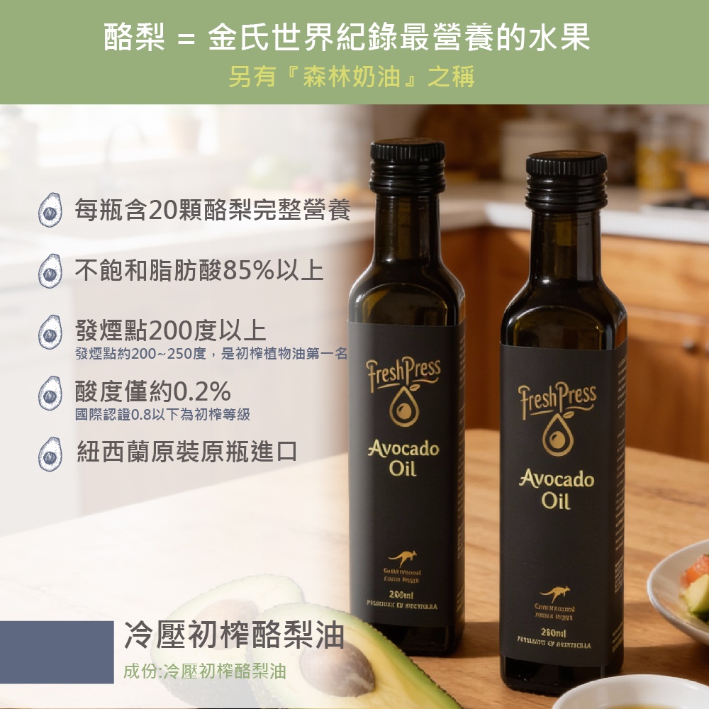 商品品名:Fresh Press 紐西蘭頂級冷壓初榨檸檬風味酪梨油
