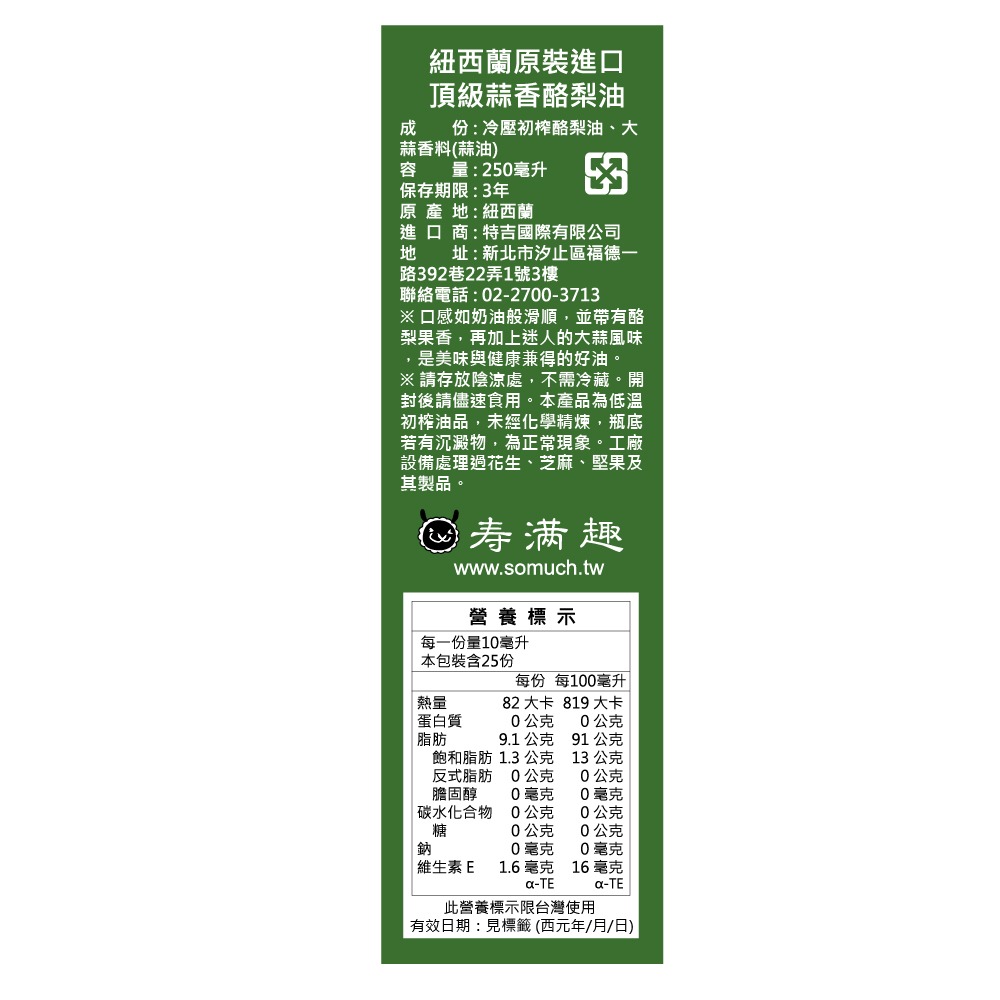 商品品名:Somuch 紐西蘭頂級冷壓初榨蒜香風味酪梨油